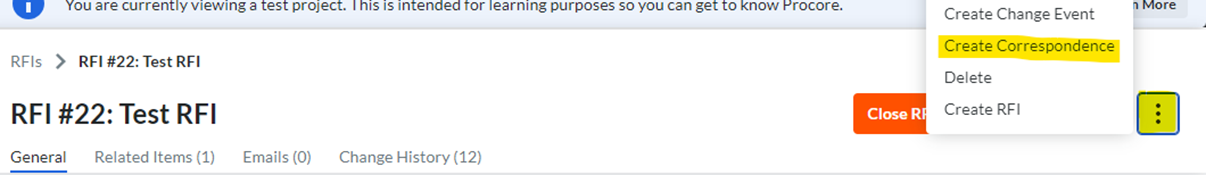 To create a Correspondence from an RFI (e.g. to create a CI linked to the RFI), open the RFI.