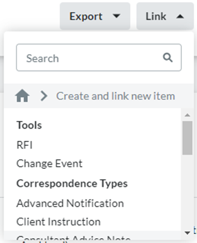The other way to link items is to Create and Link – this is for the Correspondence tool and the RFI tool.